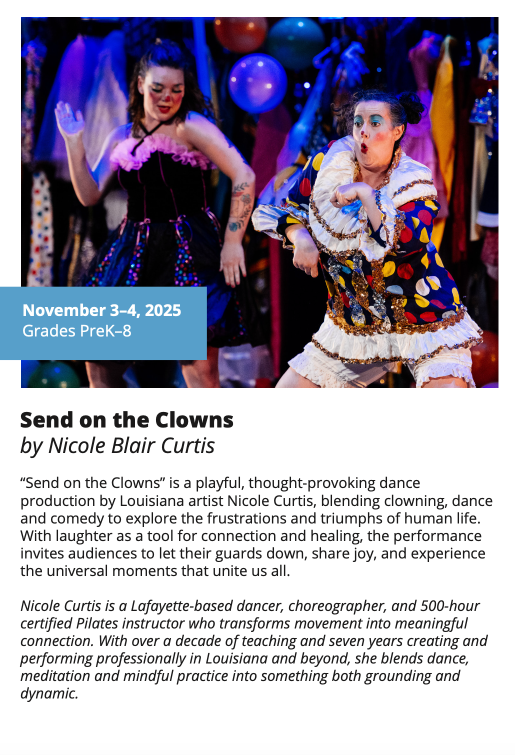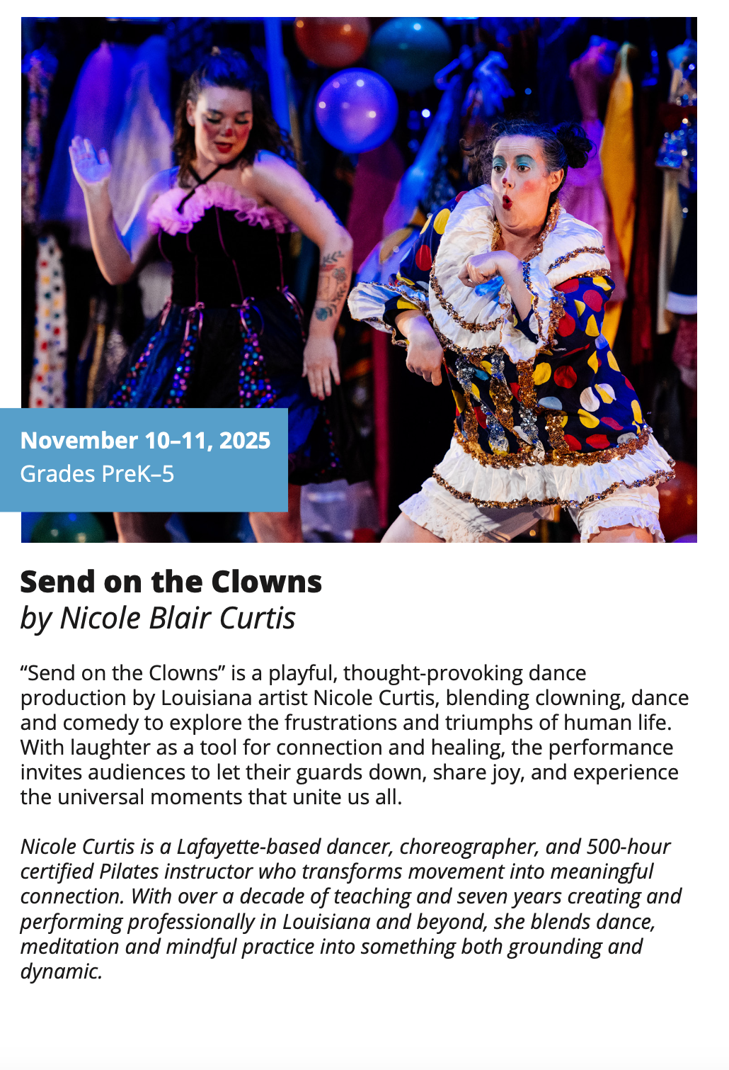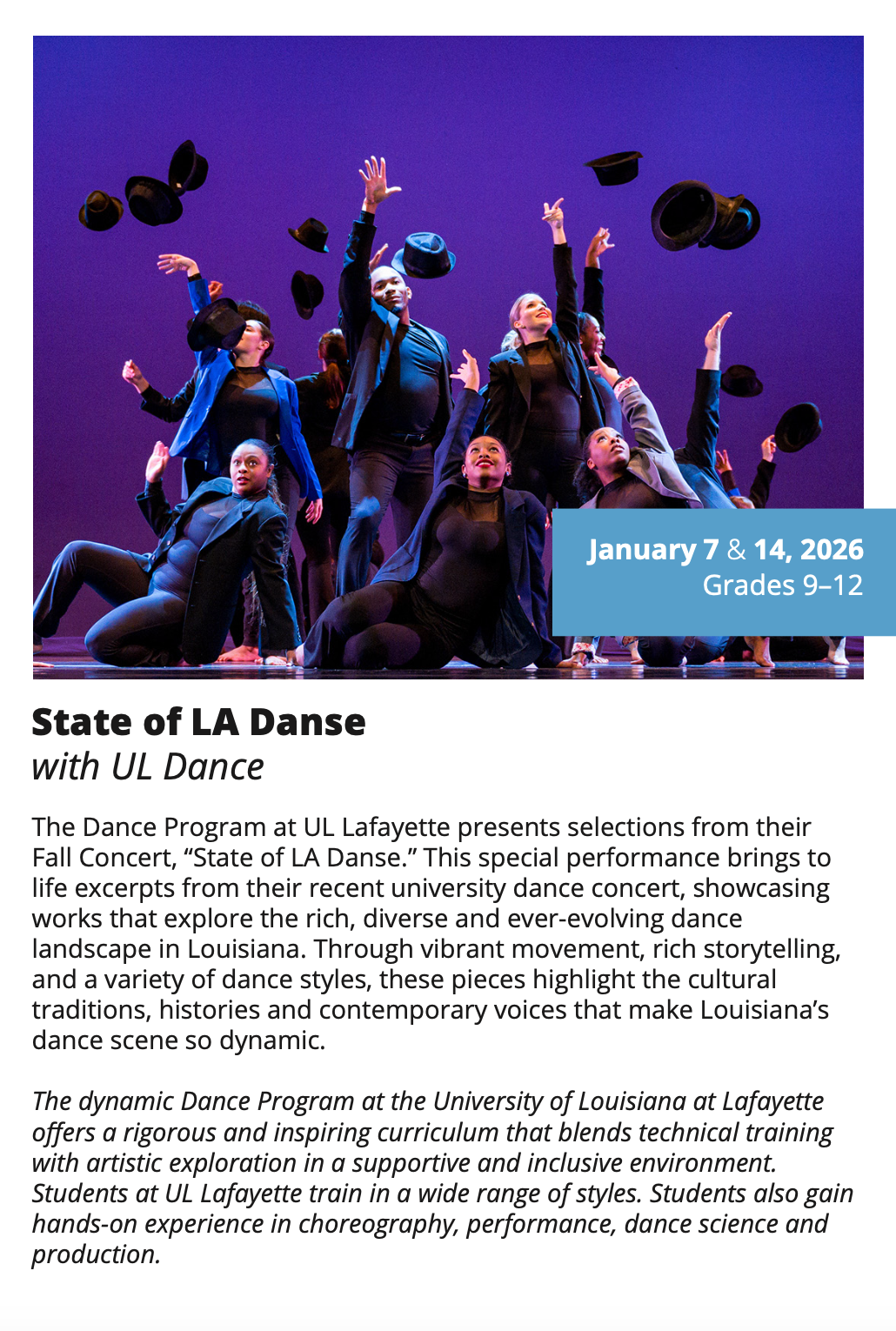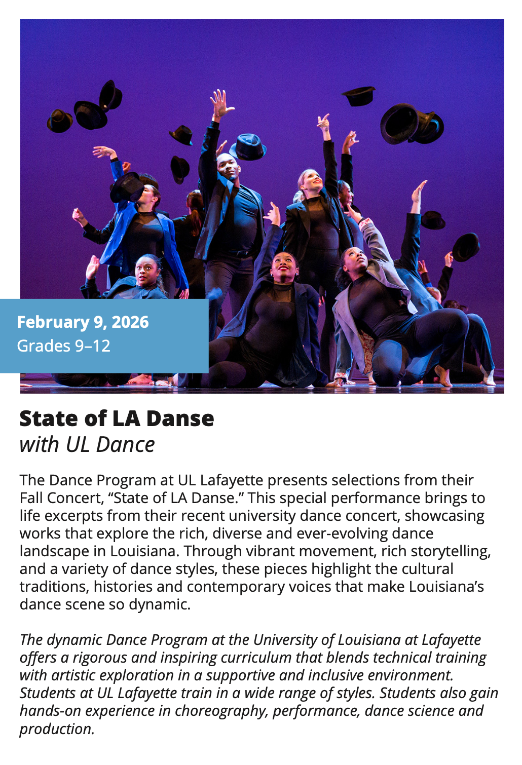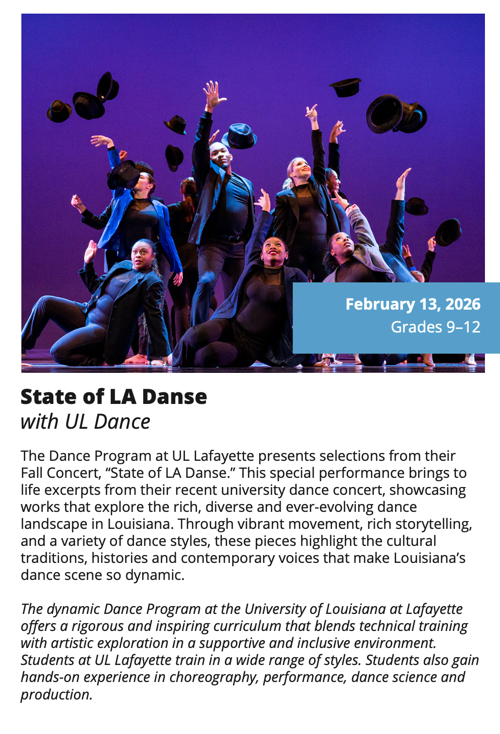 In-School Performance Iberia Parish | Lafayette Parish | St. Landry Parish | St. Martin Parish | Vermilion Parish Bring Quality, Live Performances to Your School! Introduce your students to professional performances in dance, theatre, music, puppetry, storytelling and more! Schools in participating districts each receive one performance paid for by their district. Iberia Parish Lafayette Parish St. Landry Parish St. Martin Parish Vermilion Parish Iberia Parish In-School performances 2025-2026Â BOOK A PERFORMANCE IN IBERIA PARISH Lafayette Parish In-School performances 2025-2026Â BOOK A PERFORMANCE IN LAFAYETTE PARISH St. Landry Parish In-School performances 2025-2026 BOOK A PERFORMANCE IN ST. LANDRY PARISH St. Martin Parish In-School performances 2025-2026 BOOK A PERFORMANCE IN ST. MARTIN PARISH Vermilion Parish In-School performances 2025-2026 BOOK A PERFORMANCE IN VERMILION PARISH