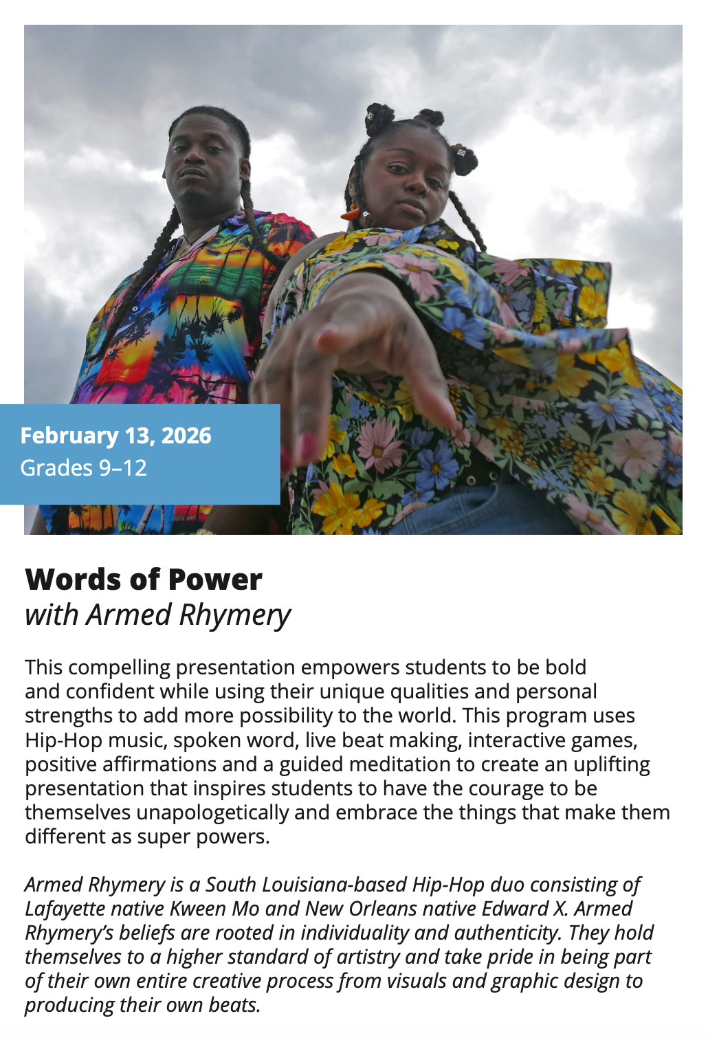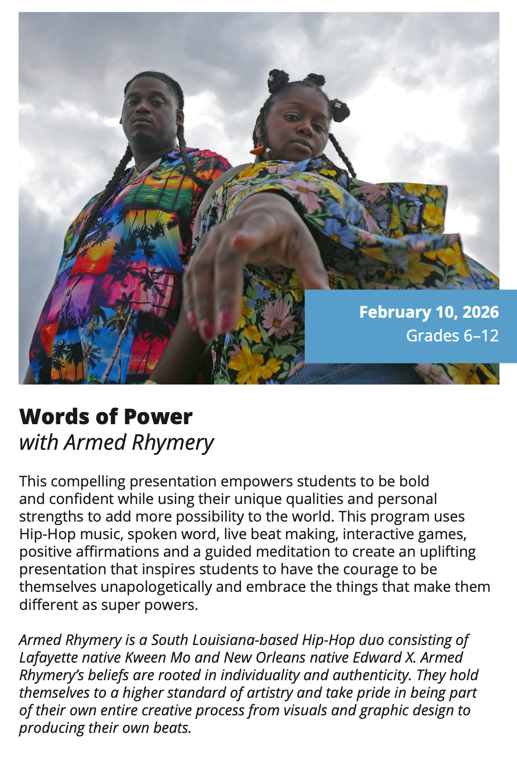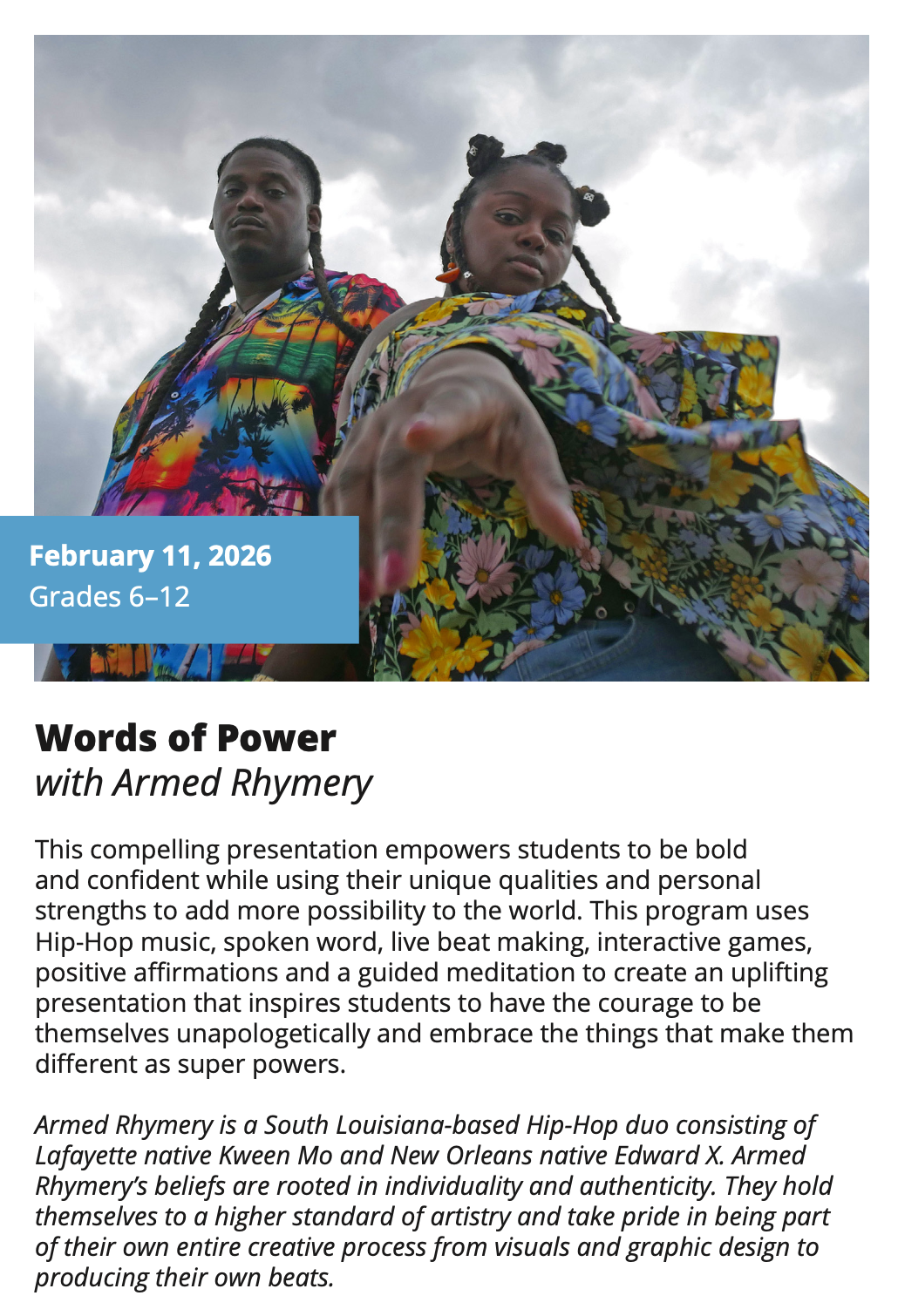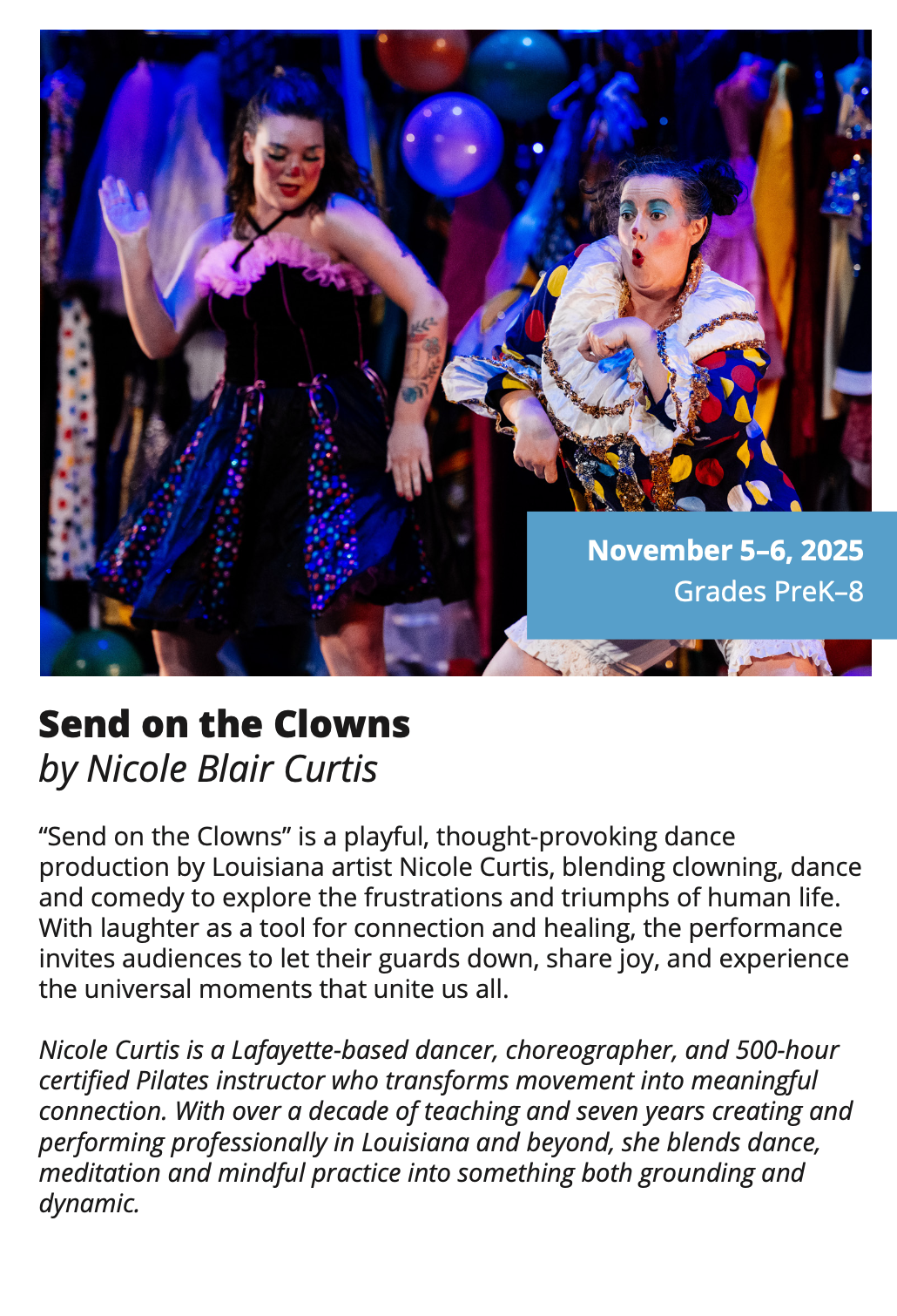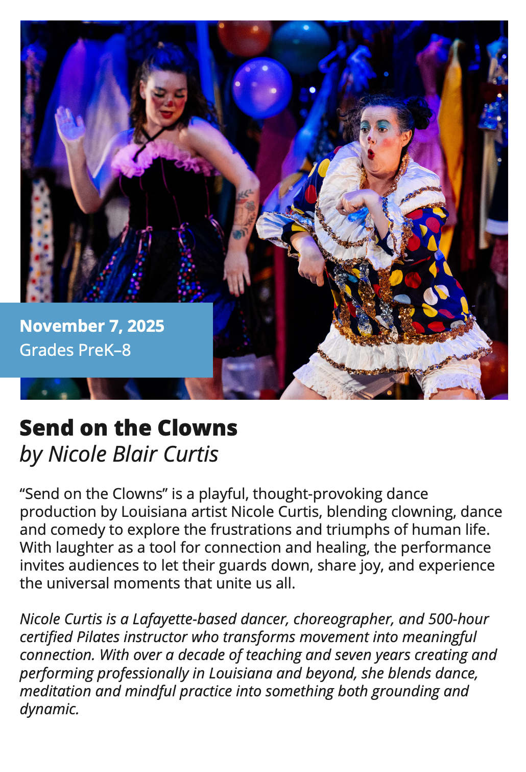In-School Performance Iberia Parish | Lafayette Parish | St. Landry Parish | St. Martin Parish | Vermilion Parish Bring Quality, Live Performances to Your School! Introduce your students to professional performances in dance, theatre, music, puppetry, storytelling and more! Schools in participating districts each receive one performance paid for by their district. Iberia Parish Lafayette Parish St. Landry Parish St. Martin Parish Vermilion Parish Iberia Parish In-School performances 2025-2026Â BOOK A PERFORMANCE IN IBERIA PARISH Lafayette Parish In-School performances 2025-2026Â BOOK A PERFORMANCE IN LAFAYETTE PARISH St. Landry Parish In-School performances 2025-2026 BOOK A PERFORMANCE IN ST. LANDRY PARISH St. Martin Parish In-School performances 2025-2026 BOOK A PERFORMANCE IN ST. MARTIN PARISH Vermilion Parish In-School performances 2025-2026 BOOK A PERFORMANCE IN VERMILION PARISH