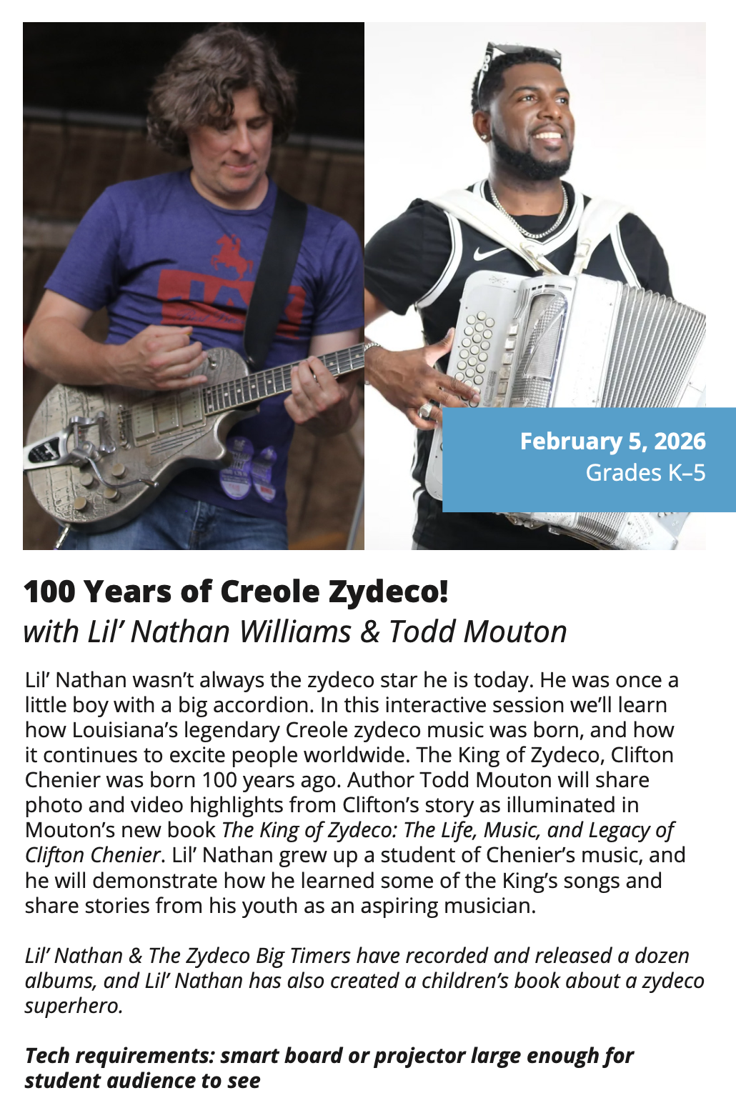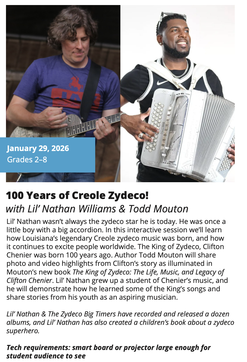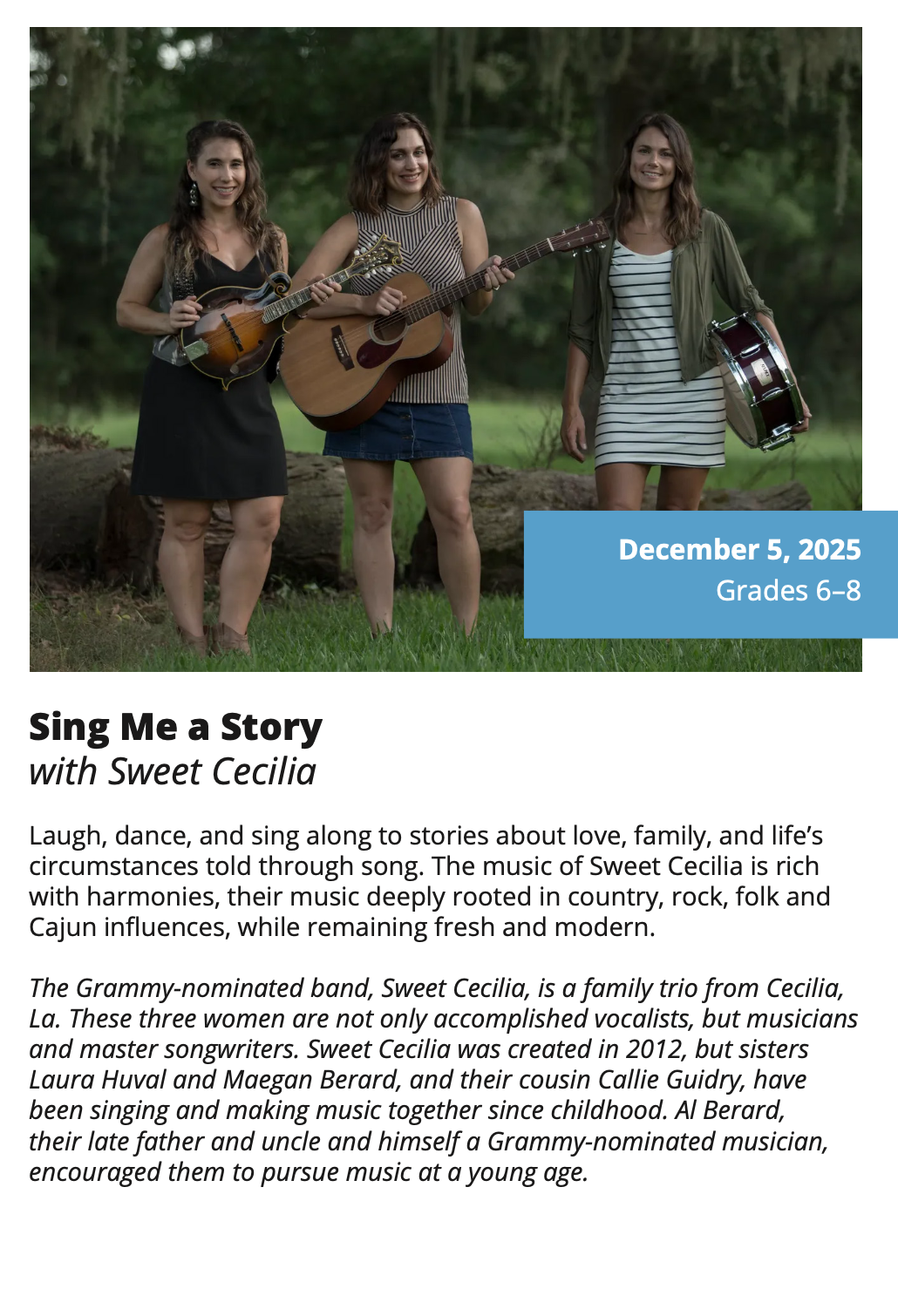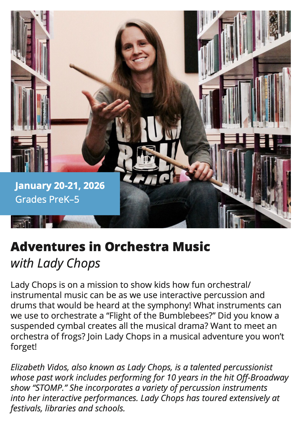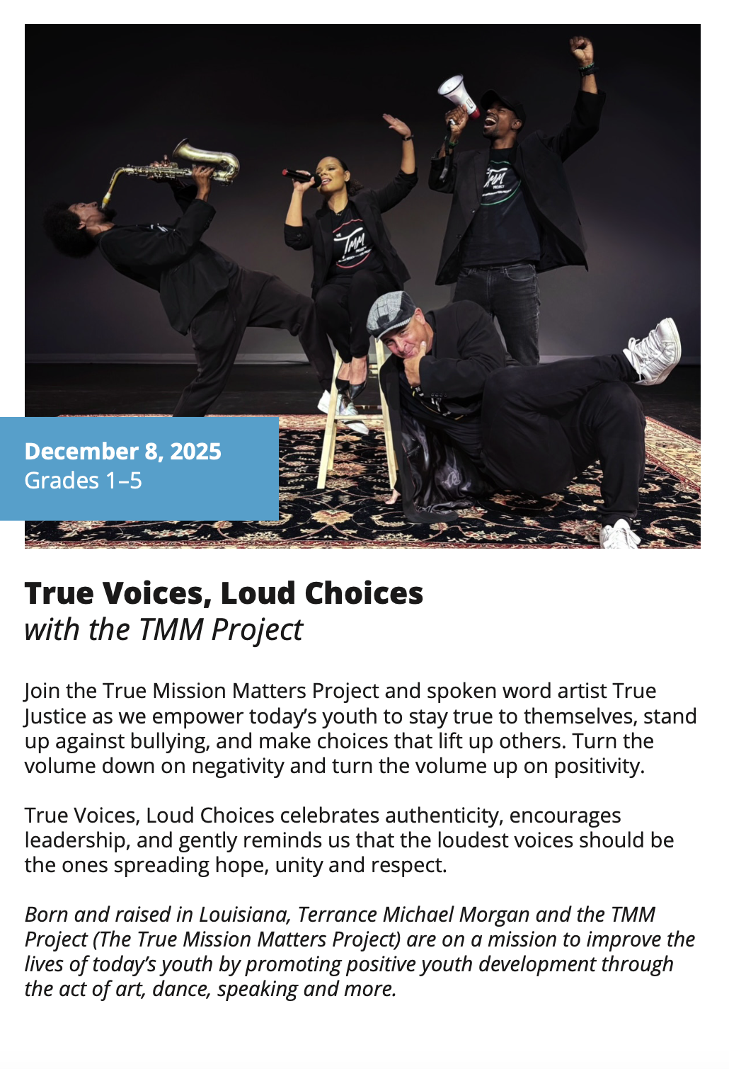 In-School Performance Iberia Parish | Lafayette Parish | St. Landry Parish | St. Martin Parish | Vermilion Parish Bring Quality, Live Performances to Your School! Introduce your students to professional performances in dance, theatre, music, puppetry, storytelling and more! Schools in participating districts each receive one performance paid for by their district. Iberia Parish Lafayette Parish St. Landry Parish St. Martin Parish Vermilion Parish Iberia Parish In-School performances 2025-2026Â BOOK A PERFORMANCE IN IBERIA PARISH Lafayette Parish In-School performances 2025-2026Â BOOK A PERFORMANCE IN LAFAYETTE PARISH St. Landry Parish In-School performances 2025-2026 BOOK A PERFORMANCE IN ST. LANDRY PARISH St. Martin Parish In-School performances 2025-2026 BOOK A PERFORMANCE IN ST. MARTIN PARISH Vermilion Parish In-School performances 2025-2026 BOOK A PERFORMANCE IN VERMILION PARISH
