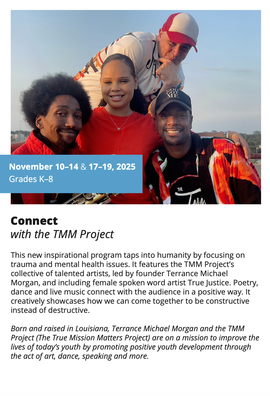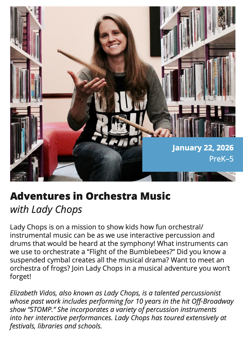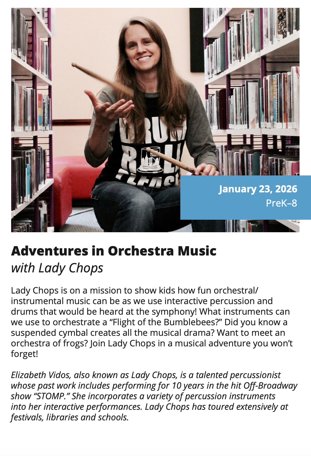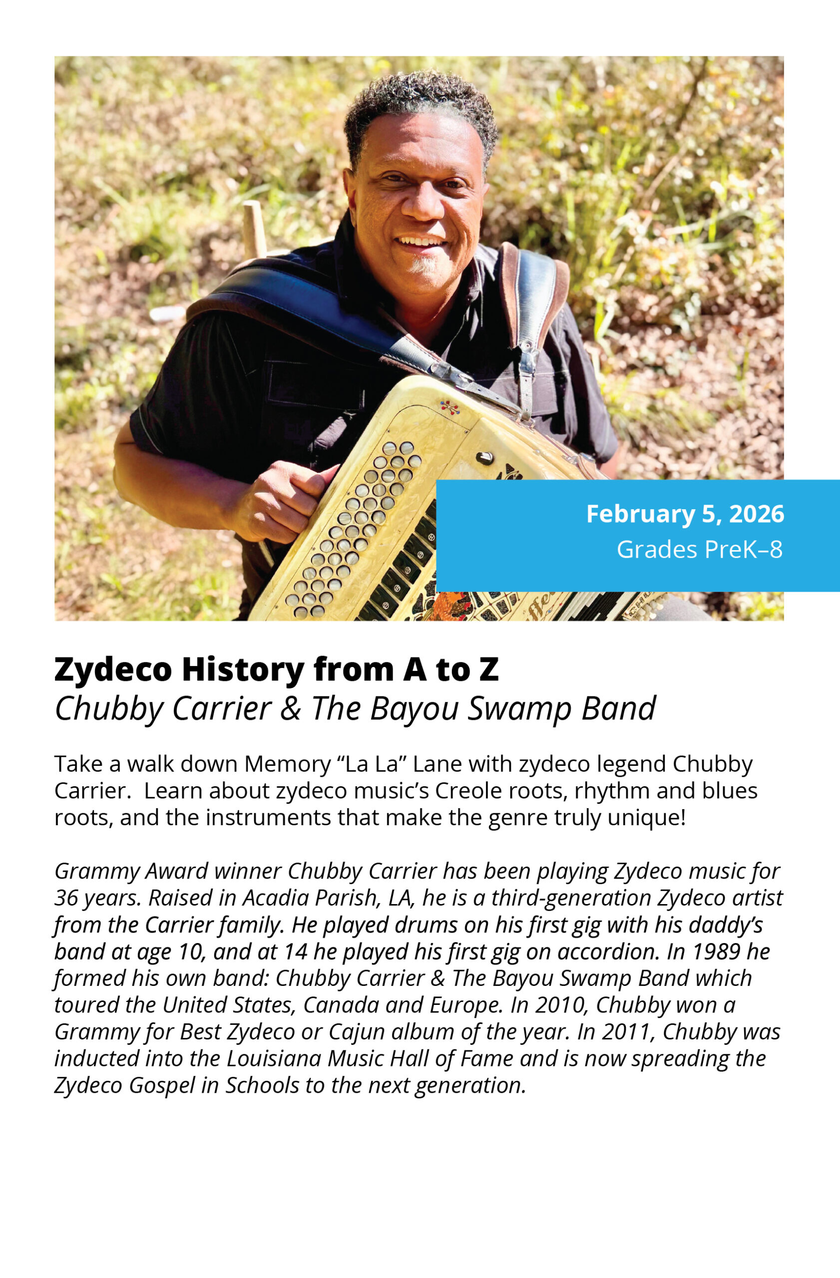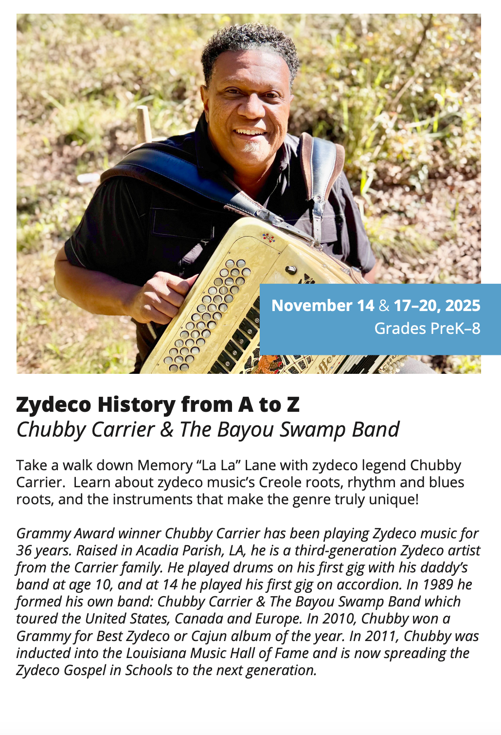 In-School Performance Iberia Parish | Lafayette Parish | St. Landry Parish | St. Martin Parish | Vermilion Parish Bring Quality, Live Performances to Your School! Introduce your students to professional performances in dance, theatre, music, puppetry, storytelling and more! Schools in participating districts each receive one performance paid for by their district. Iberia Parish Lafayette Parish St. Landry Parish St. Martin Parish Vermilion Parish Iberia Parish In-School performances 2025-2026Â BOOK A PERFORMANCE IN IBERIA PARISH Lafayette Parish In-School performances 2025-2026Â BOOK A PERFORMANCE IN LAFAYETTE PARISH St. Landry Parish In-School performances 2025-2026 BOOK A PERFORMANCE IN ST. LANDRY PARISH St. Martin Parish In-School performances 2025-2026 BOOK A PERFORMANCE IN ST. MARTIN PARISH Vermilion Parish In-School performances 2025-2026 BOOK A PERFORMANCE IN VERMILION PARISH