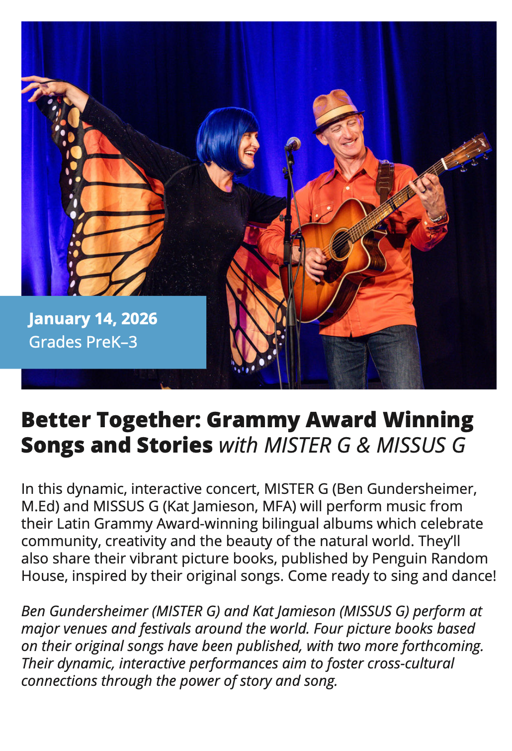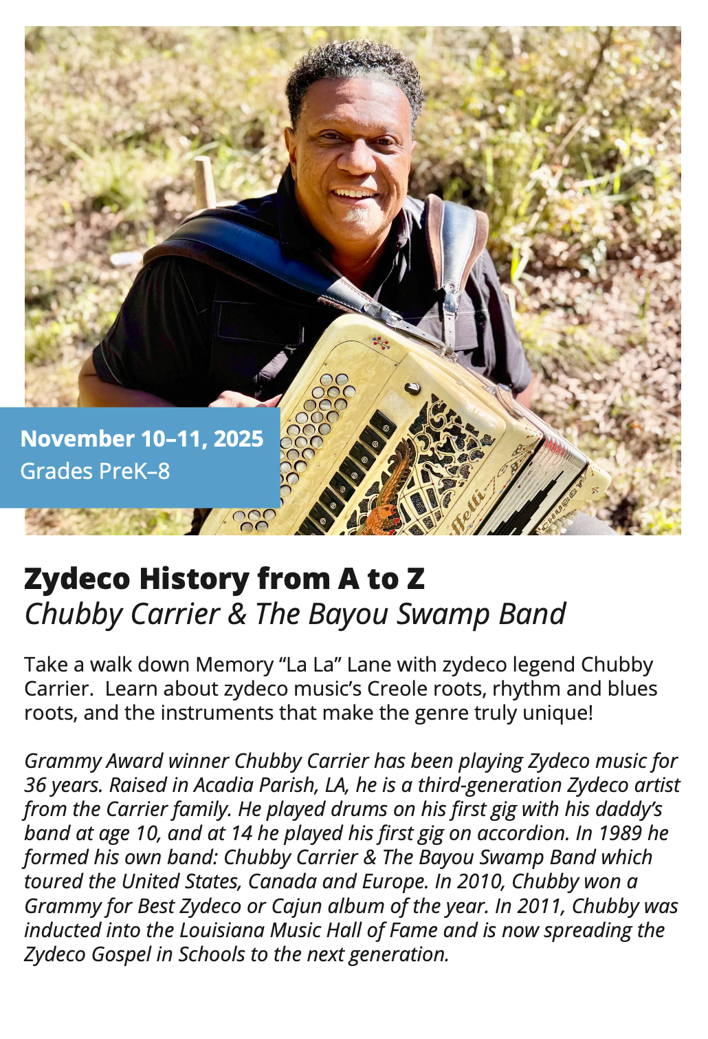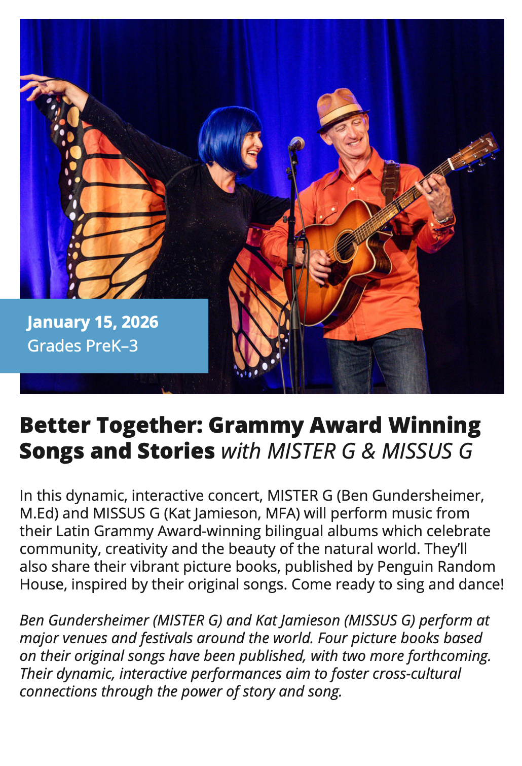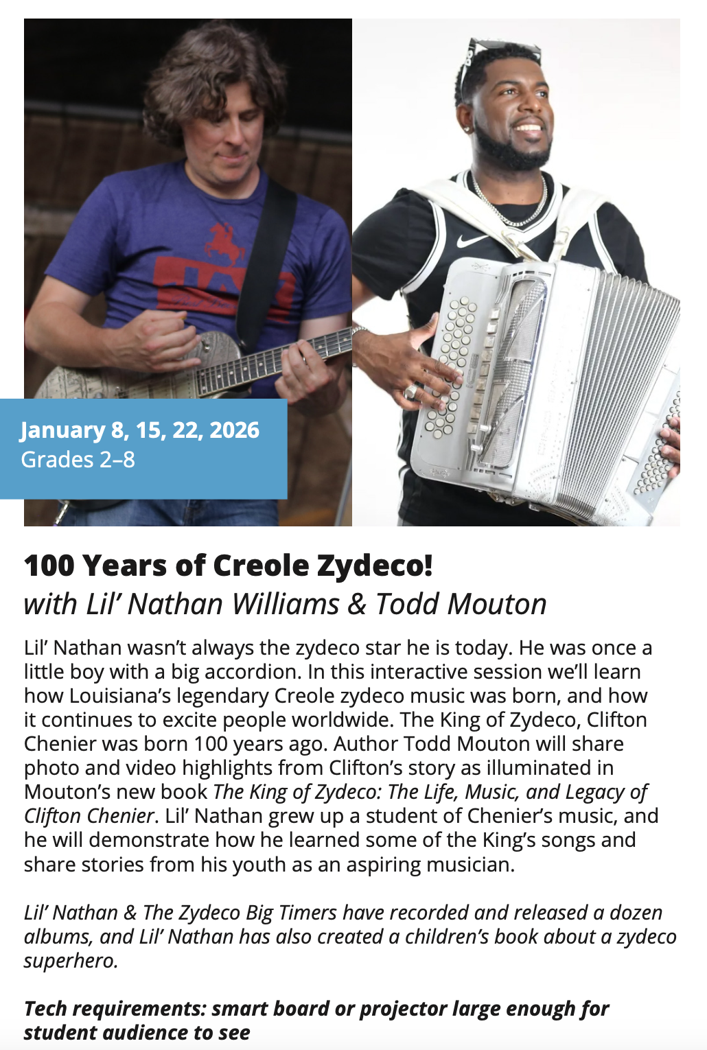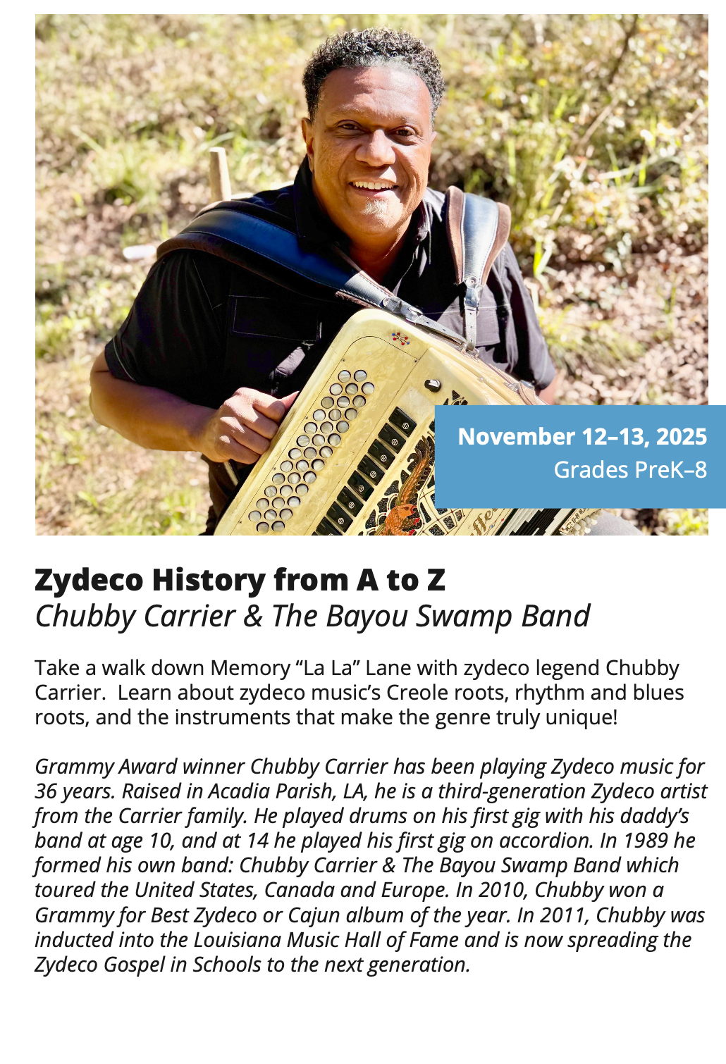 In-School Performance Iberia Parish | Lafayette Parish | St. Landry Parish | St. Martin Parish | Vermilion Parish Bring Quality, Live Performances to Your School! Introduce your students to professional performances in dance, theatre, music, puppetry, storytelling and more! Schools in participating districts each receive one performance paid for by their district. Iberia Parish Lafayette Parish St. Landry Parish St. Martin Parish Vermilion Parish Iberia Parish In-School performances 2025-2026Â BOOK A PERFORMANCE IN IBERIA PARISH Lafayette Parish In-School performances 2025-2026Â BOOK A PERFORMANCE IN LAFAYETTE PARISH St. Landry Parish In-School performances 2025-2026 BOOK A PERFORMANCE IN ST. LANDRY PARISH St. Martin Parish In-School performances 2025-2026 BOOK A PERFORMANCE IN ST. MARTIN PARISH Vermilion Parish In-School performances 2025-2026 BOOK A PERFORMANCE IN VERMILION PARISH