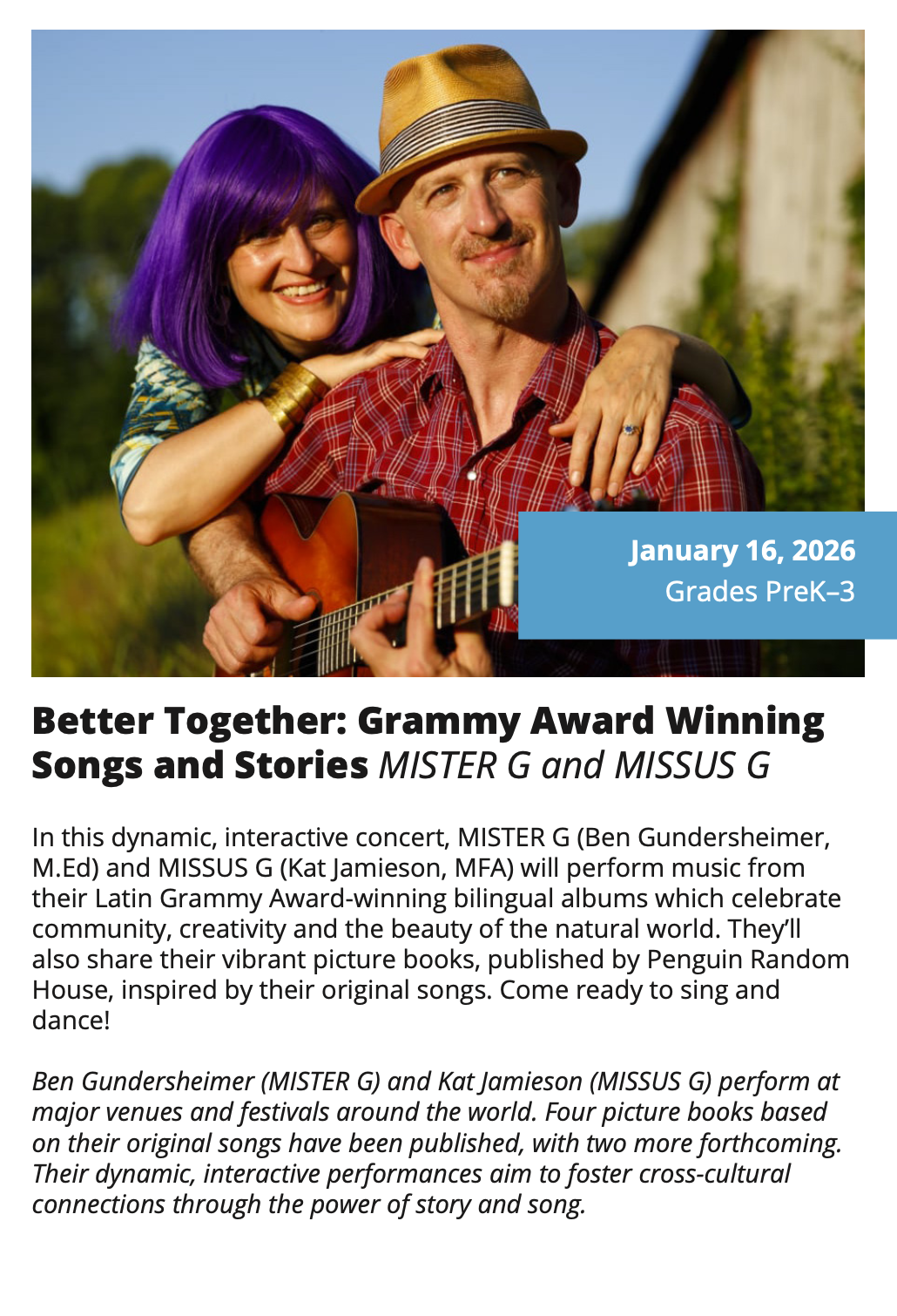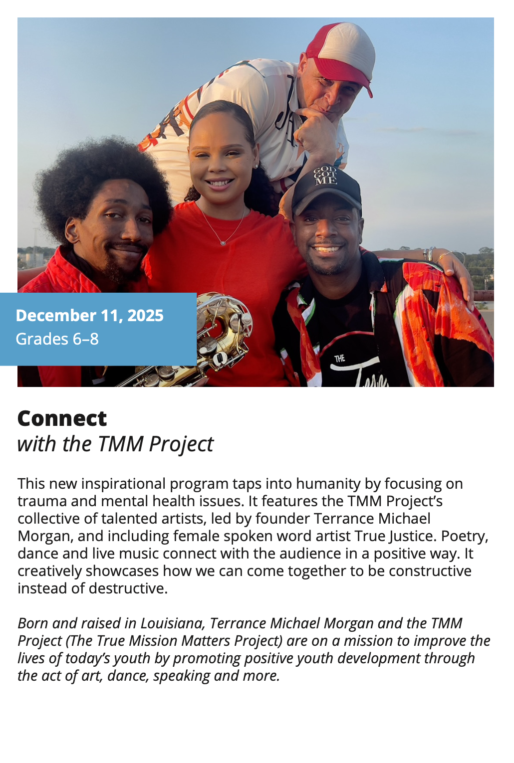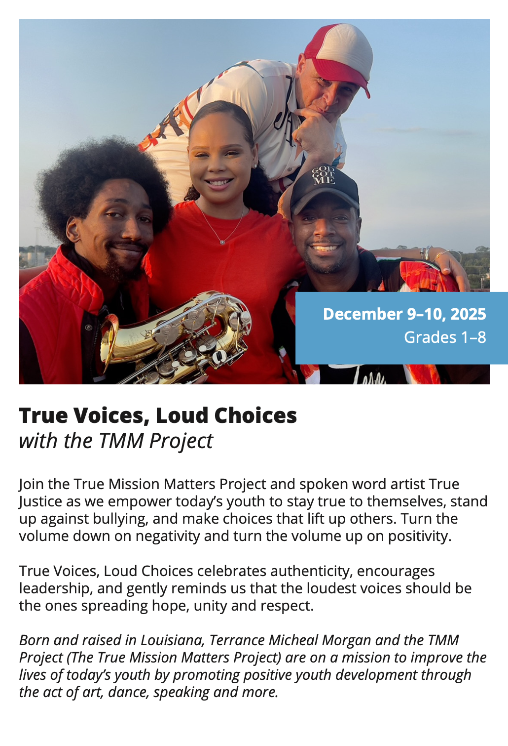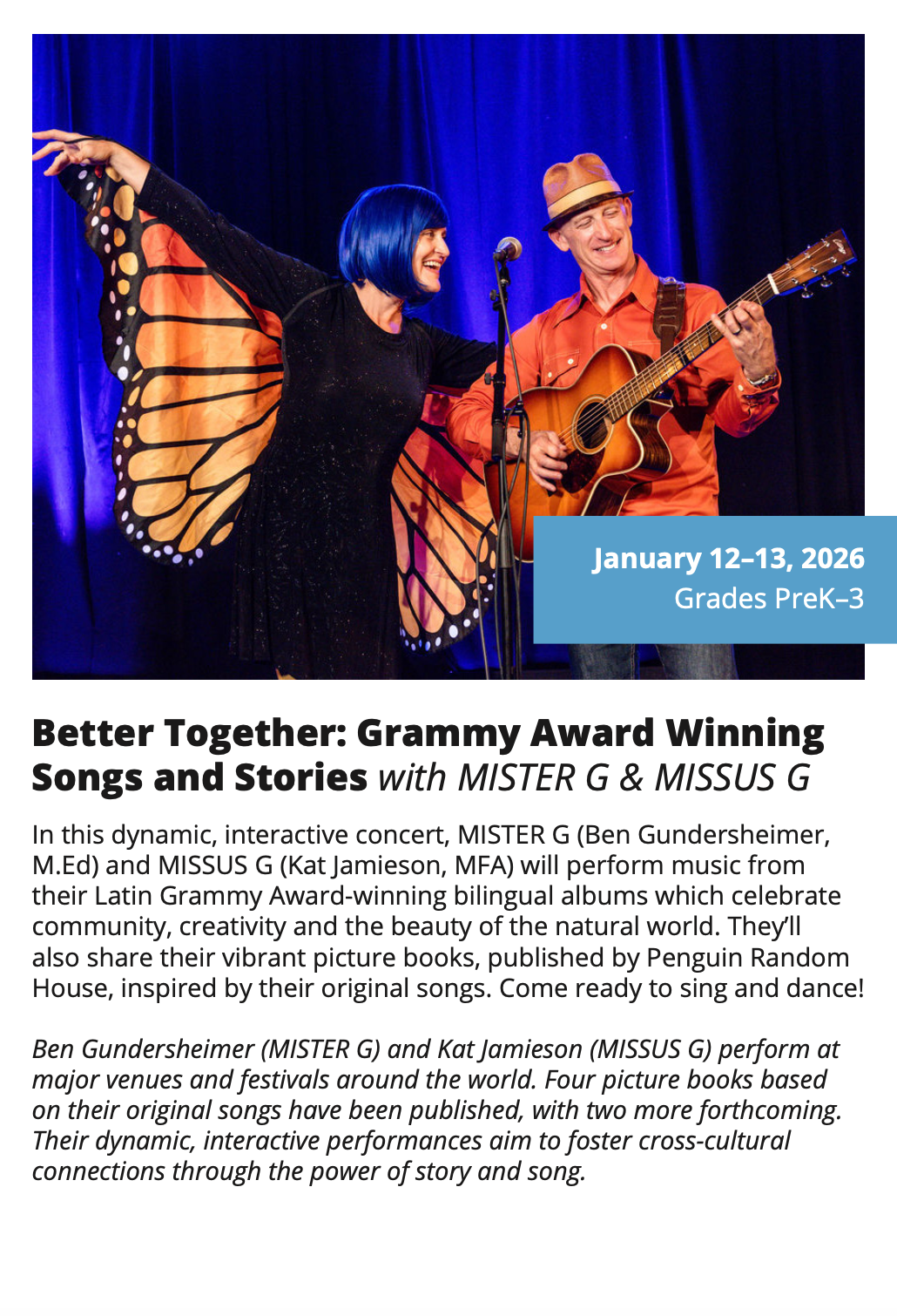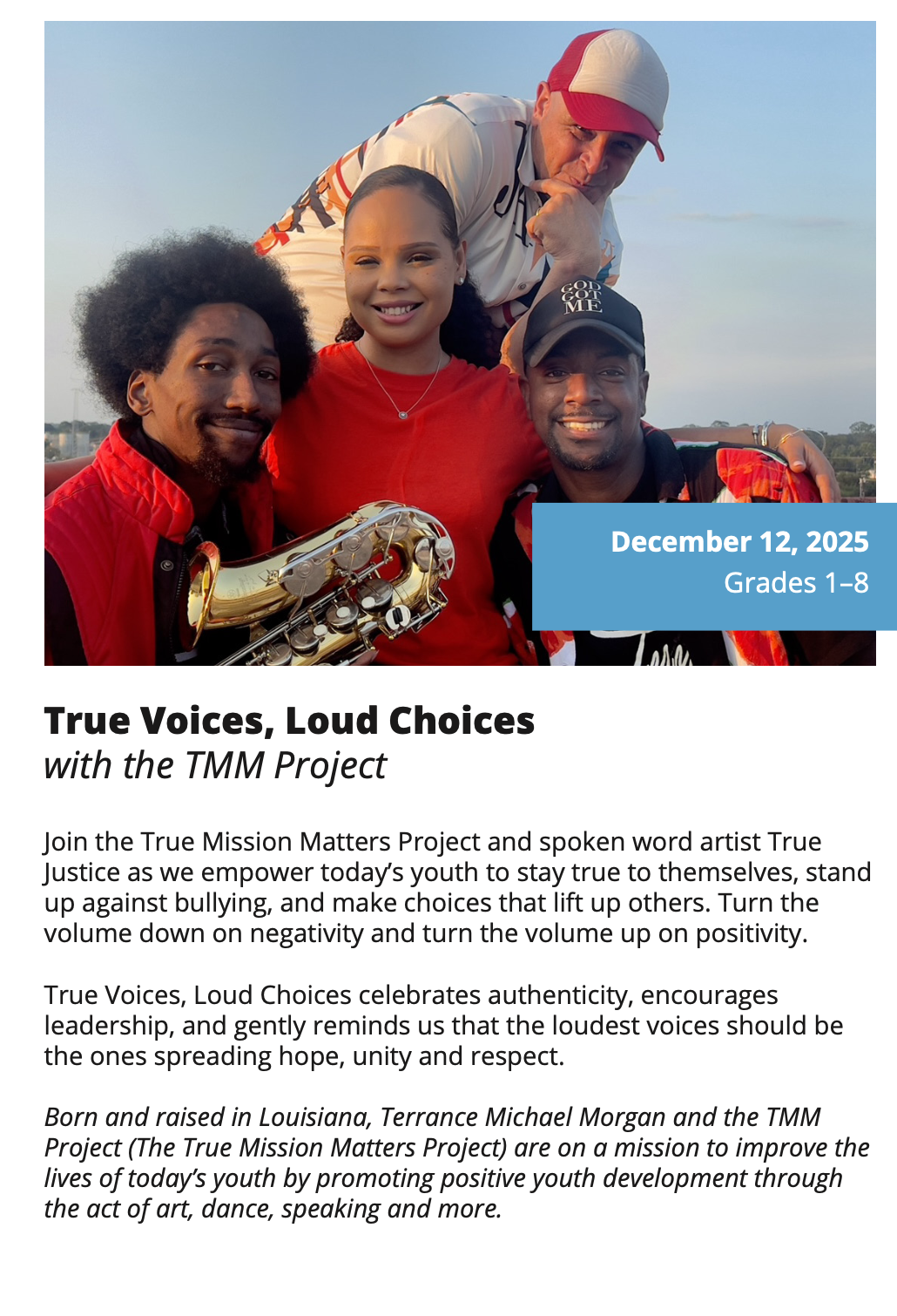 In-School Performance Iberia Parish | Lafayette Parish | St. Landry Parish | St. Martin Parish | Vermilion Parish Bring Quality, Live Performances to Your School! Introduce your students to professional performances in dance, theatre, music, puppetry, storytelling and more! Schools in participating districts each receive one performance paid for by their district. Iberia Parish Lafayette Parish St. Landry Parish St. Martin Parish Vermilion Parish Iberia Parish In-School performances 2025-2026Â BOOK A PERFORMANCE IN IBERIA PARISH Lafayette Parish In-School performances 2025-2026Â BOOK A PERFORMANCE IN LAFAYETTE PARISH St. Landry Parish In-School performances 2025-2026 BOOK A PERFORMANCE IN ST. LANDRY PARISH St. Martin Parish In-School performances 2025-2026 BOOK A PERFORMANCE IN ST. MARTIN PARISH Vermilion Parish In-School performances 2025-2026 BOOK A PERFORMANCE IN VERMILION PARISH